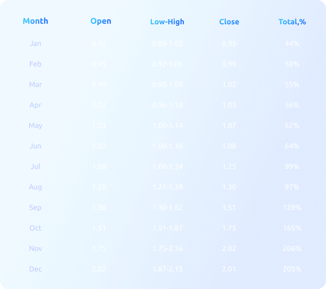 According to the current projections, minimum prices are likely to stay around $2.11–$2.14, while maximum values could reach up to $2.55 early in the year. The average trading price is projected to range between $2.14 and $2.46, suggesting moderate but stable growth. Cardano’s commitment to innovation gives it a strong foundation for ongoing success – even in more optimistic or bullish scenario projections.