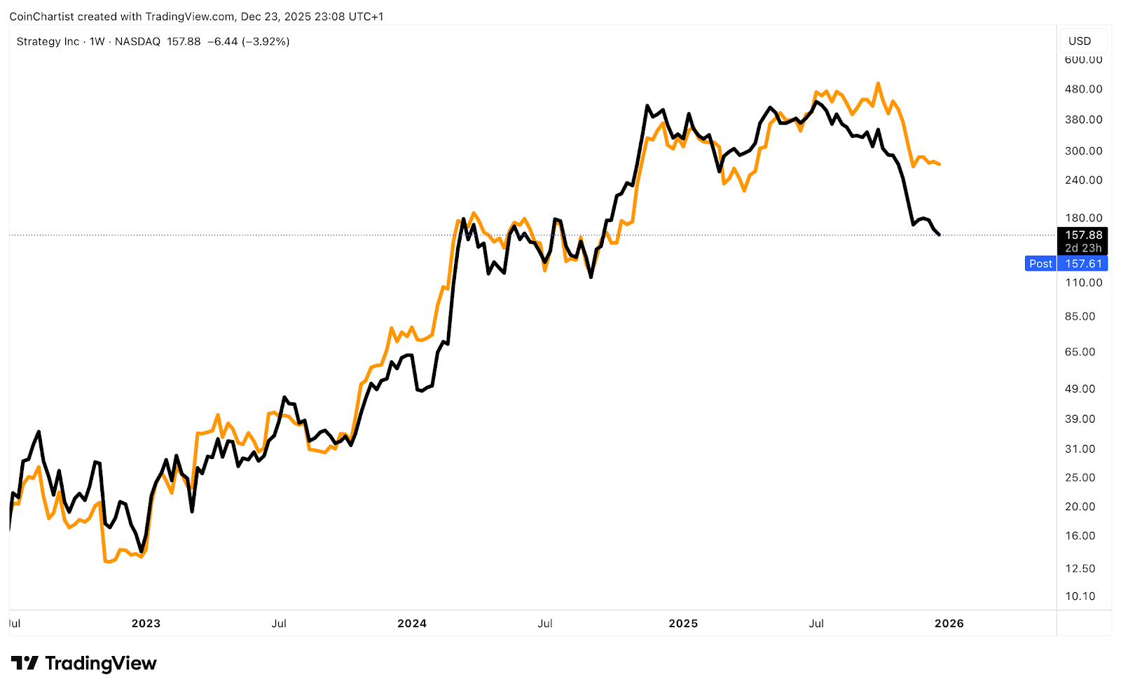 Bitcoin (orange) versus MSTR (black)