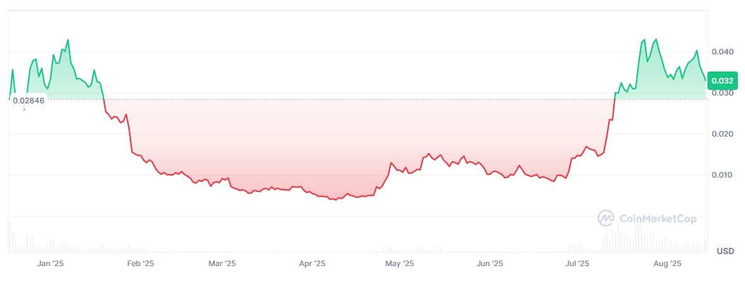 The nearest support levels sit roughly at $0.032, $0.029, and $0.025, while immediate resistances are around $0.039, $0.042, and $0.046.