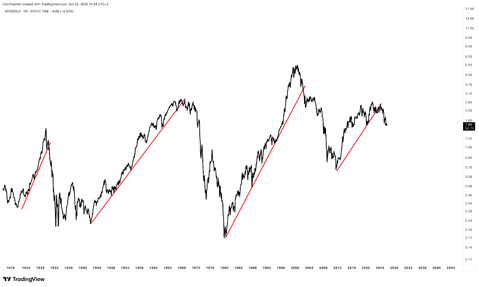 The S&P500/Gold ratio shows a shift towards hard assets