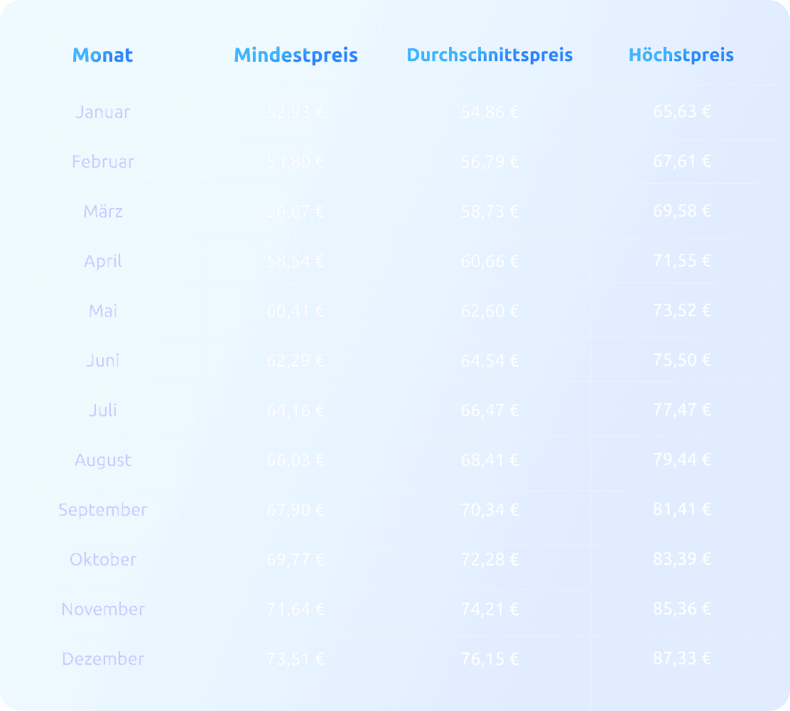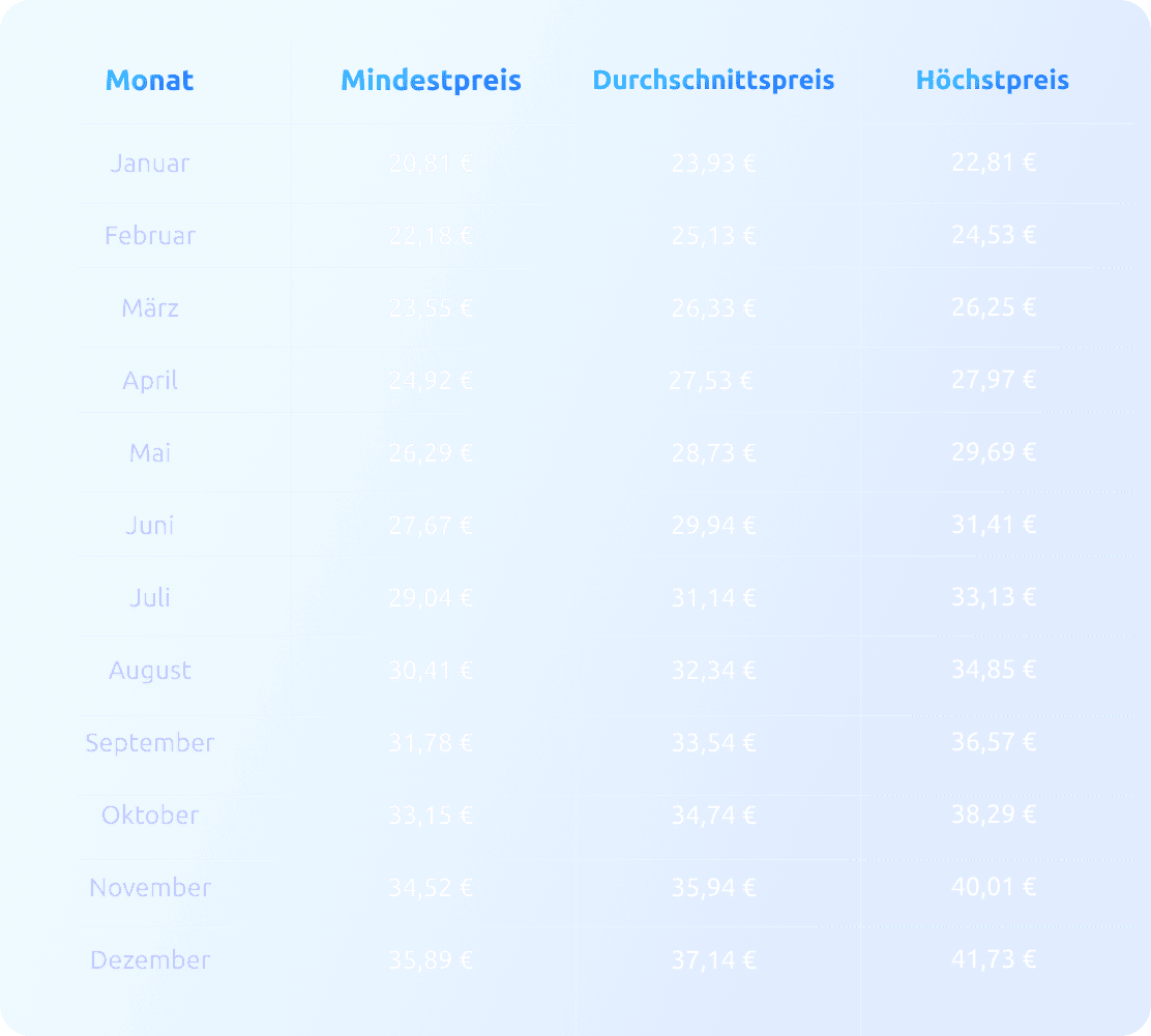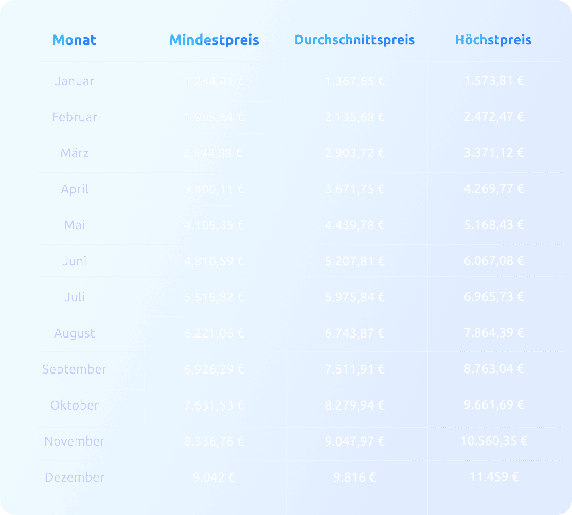 Nachfolgend finden Sie eine detaillierte monatliche Aufschlüsselung der minimalen, durchschnittlichen und maximalen prognostizierten Handelspreise für 2028: