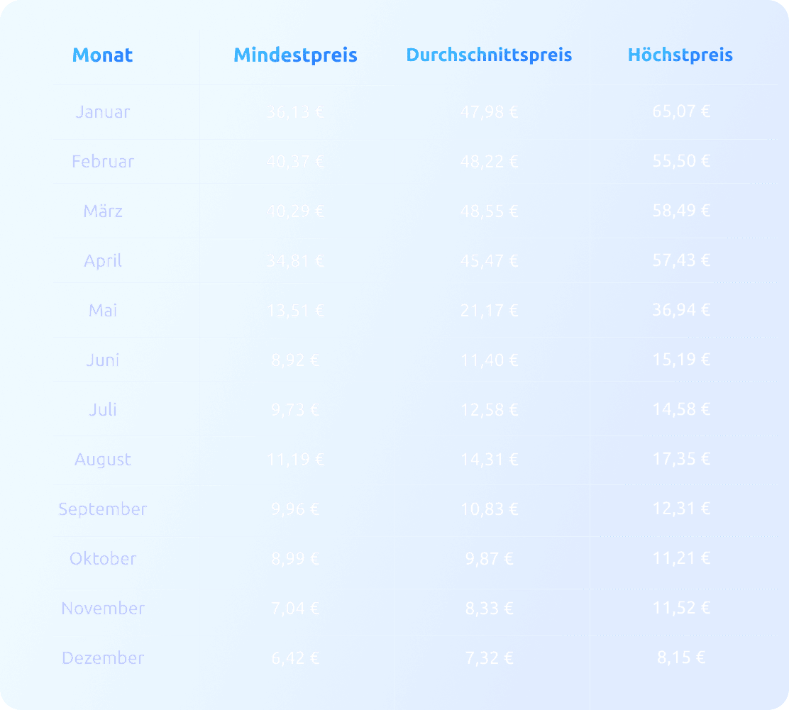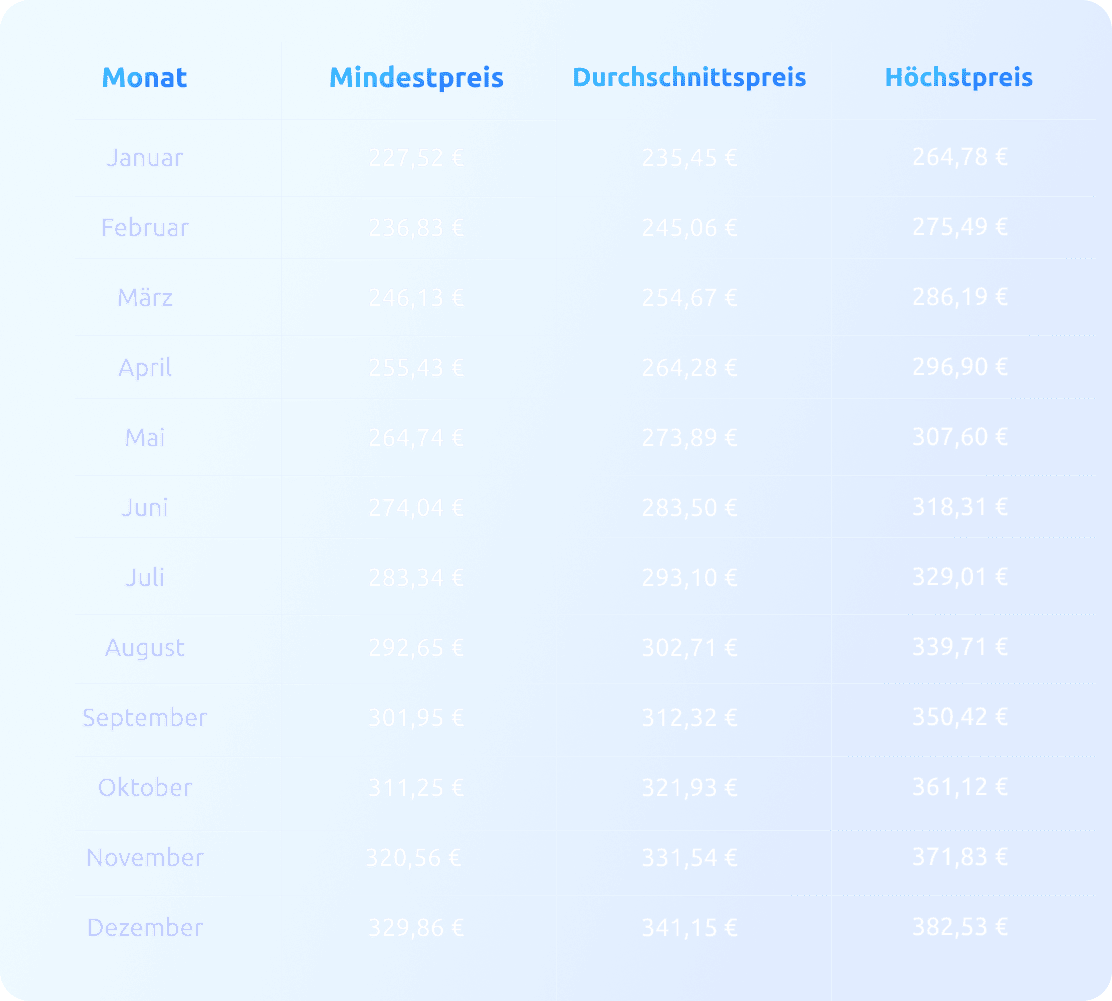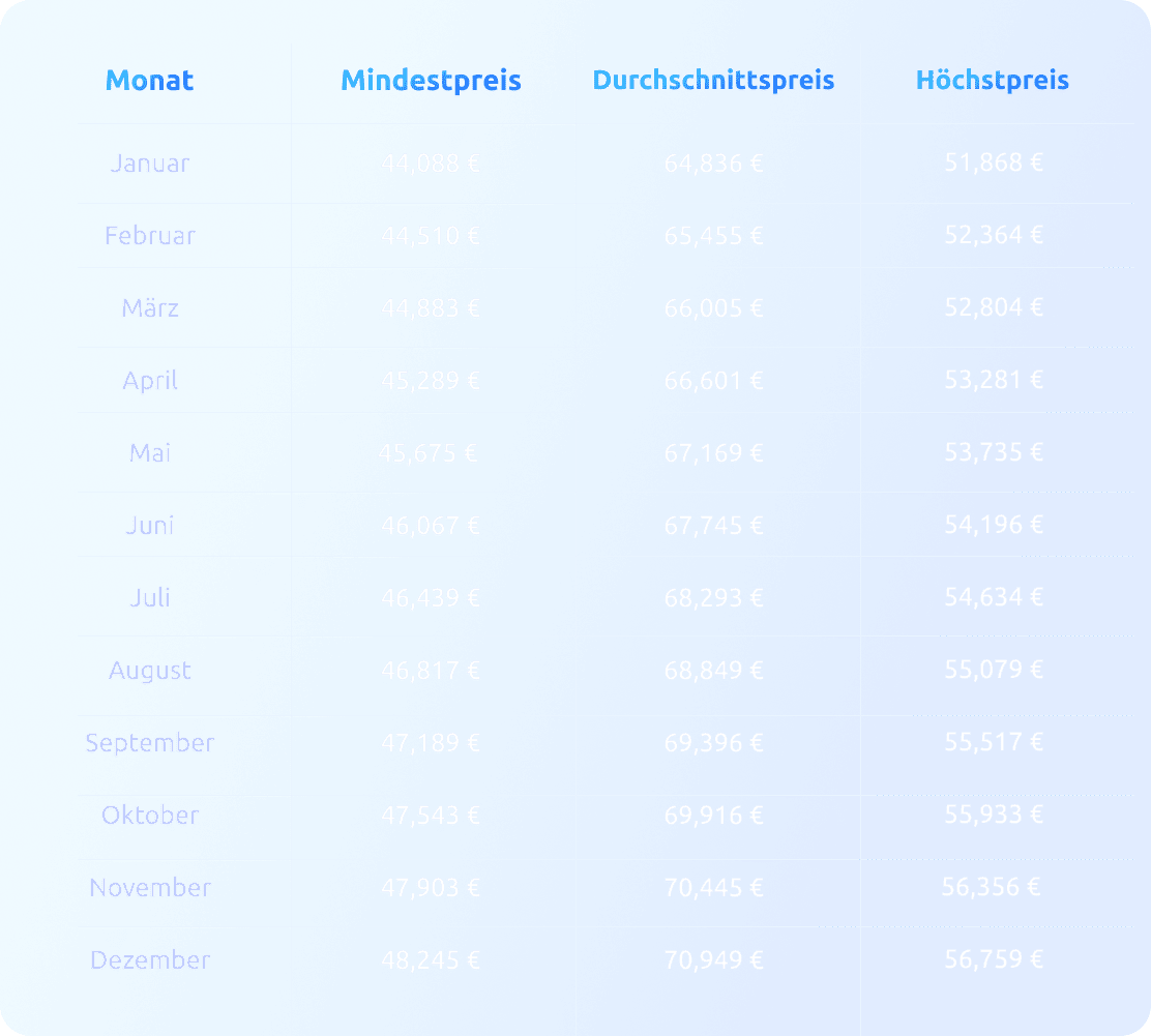 Nachfolgend finden Sie eine detaillierte monatliche Aufschlüsselung der minimalen, durchschnittlichen und maximalen prognostizierten Handelspreise für 2028: