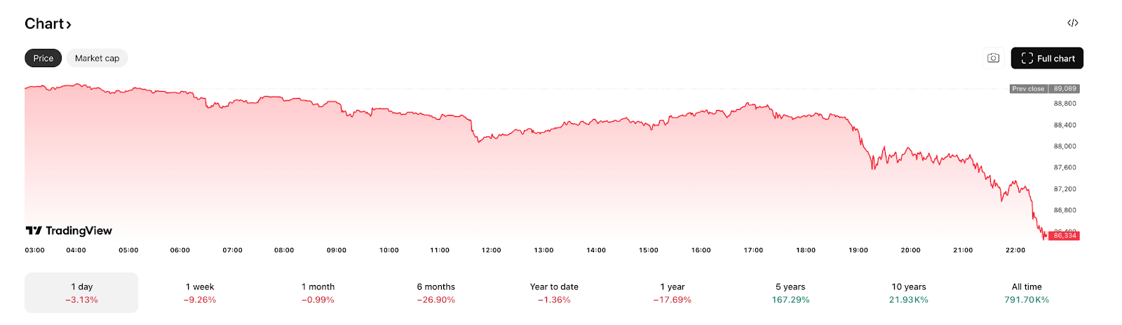 Anfang 2026 stabilisierte sich Bitcoin um 87.515-89.172 $ (≈79.700-81.300 €), was einer Korrektur von -18 bis -20% vom Dezember-Allzeithoch entspricht. Der Fear & Greed Index fiel auf 24-27 (Extreme Fear), was die vorübergehende Vorsicht der Investoren widerspiegelte. Die Performance seit Jahresbeginn 2026 liegt bei -8 bis -10%.
