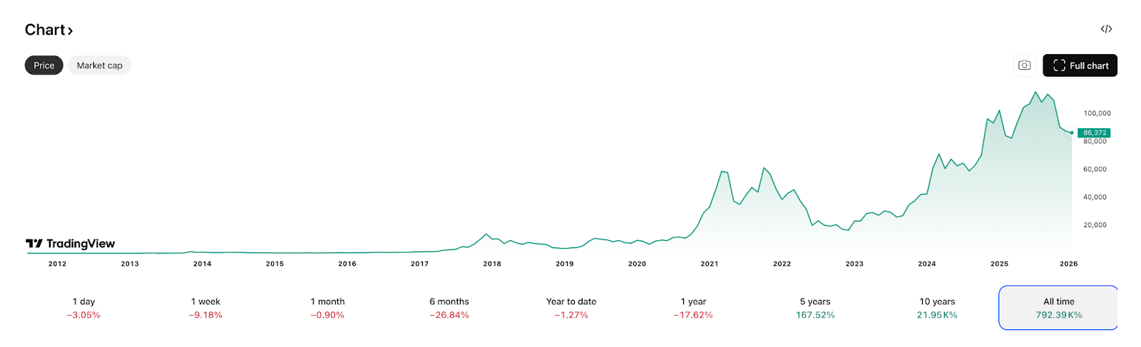 Die Frage, ob Bitcoin steigen wird, hängt von mehreren miteinander verbundenen Faktoren ab. Historisch hat Bitcoin bemerkenswerte Resilienz durch mehrere Bullen- und Bärenzyklen demonstriert. Im Januar 2026, nach Erreichen eines neuen Rekords von 109.114 $ im Dezember 2024, durchläuft Bitcoin eine Korrekturphase um 87.515-89.172 $, was einem Rückgang von -18 bis -20% vom Höchststand entspricht.