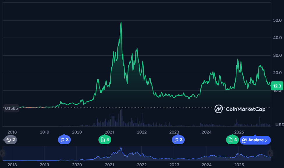 Das Jahr 2025 war geprägt von einer signifikanten Marktkorrektur für Chainlink, mit einer Gesamtperformance von -40% year-to-date. Das Jahreshoch lag bei 26-28 USD zu Beginn des Jahres, während das Jahrestief im Bereich von 11-12 USD erreicht wurde.