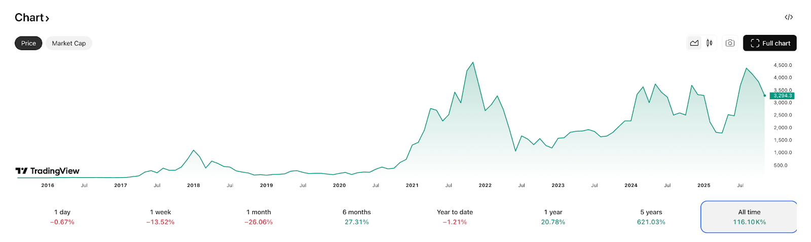2025 erlebte Ethereum ein bemerkenswertes Wachstum und erreichte im August ein neues Rekordhoch von 4.953$. Diese Performance wurde durch die Genehmigung von Ethereum-ETFs und die darauf folgenden institutionellen Zuflüsse angetrieben. Die Wiederwahl von Donald Trump im November 2024 schuf ein günstiges Momentum, das sich 2025 fortsetzte. Im November 2025 konsolidiert Ethereum um 3.293$ nach der Volatilität der letzten Monate, mit täglichen Handelsvolumen von 38 Milliarden$ und einer Marktkapitalisierung von 410 Milliarden$. Institutionelle Investoren akkumulieren weiterhin und erwarten das für Dezember 2025 geplante Fusaka-Upgrade.