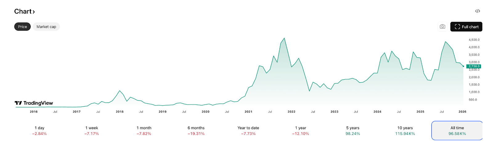 Zum Zeitpunkt der Erstellung dieses Artikels (26. Februar 2026) wurde Ethereum bei rund 1.977–2.083 $ gehandelt (Tagesrange: 1.977,13–2.082,70 $). Ethereum behält seine Position als zweitgrößte Kryptowährung der Welt mit einer Marktkapitalisierung von rund 320–340 Milliarden $ und einem täglichen Handelsvolumen gemäß aktuellen TradingView-Daten. Die Marktstimmung ist aktuell bearish (Bearish 91%), mit einem Fear & Greed Index im Bereich „Extreme Fear". Den aktuellen Preis können Sie jederzeit mithilfe von Streaming-Charts verfolgen.