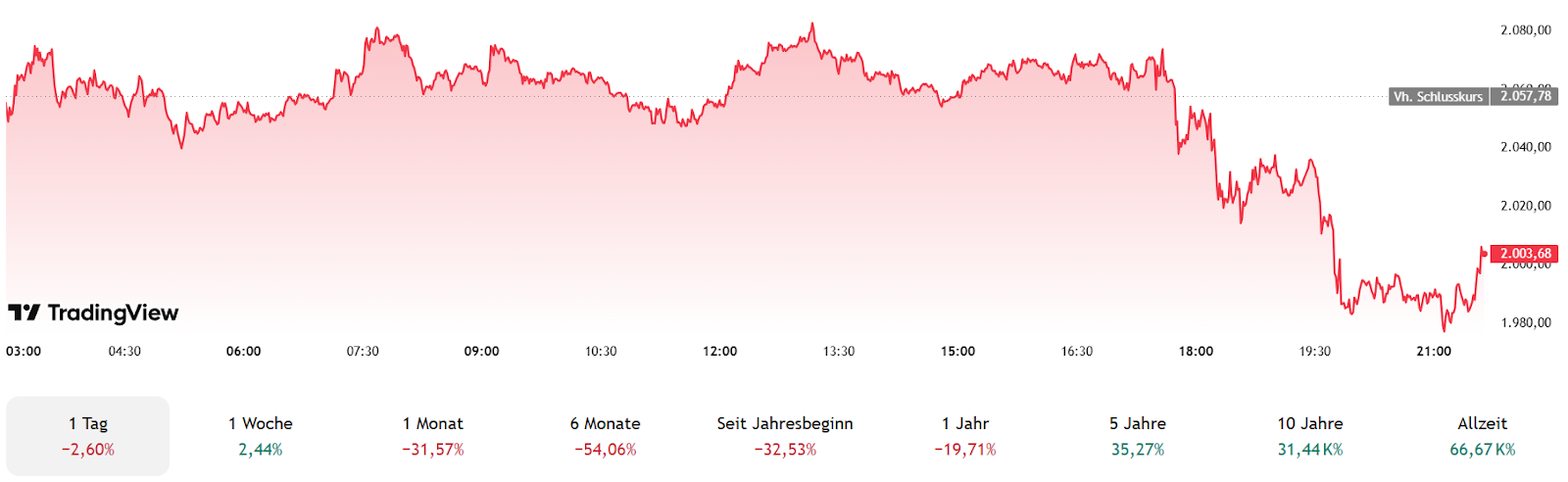 Ethereum fällt heute und hat in der vergangenen Woche 6,96 % verloren. Der aktuelle Preis liegt bei etwa 1.977–2.083 $ (ca. 1.830–1.930 €), mit einem deutlichen Rückgang gegenüber dem Januarschluss bei 2.278 $. Die Volatilität der letzten 30 Tage beträgt 15,78%, wobei ETH in den vergangenen 30 Tagen nur 13 von 30 grünen Tagen verzeichnete (43%). Technische Indikatoren zeigen klar bärische Signale: Der 50-Tage-MA fällt und liegt über dem aktuellen Preis, der 200-Tage-MA fällt seit dem 28.01.2026. Die kritische Unterstützungszone liegt bei 1.748–1.749 $, ein Bruch darunter könnte weiteren Abwärtsdruck auslösen. Die Rückeroberung der 1.950 $-Marke wäre das erste Signal für eine Stabilisierung.