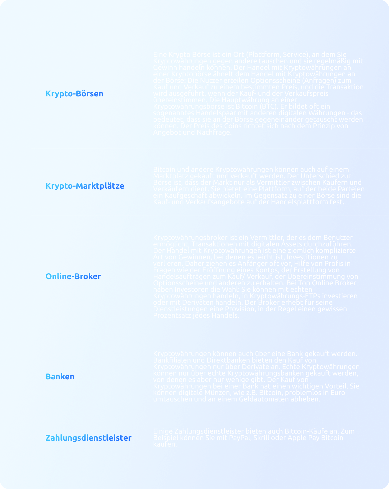 Kryptowährungen können heute auf verschiedenen Plattformen gekauft werden. Es gibt Kryptowährungsbörsen, Märkte, Online-Broker, Banken und Zahlungsdienstleister. Jede dieser Plattformen hat ihre eigenen Besonderheiten. Schauen wir uns jede dieser Plattformen genauer an.