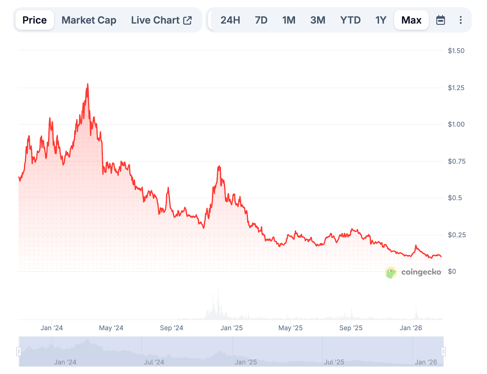 | Anfang 2026 | Aktueller Stand | ~$0,097 – $0,102 | Sekundärer Bärenmarkt |