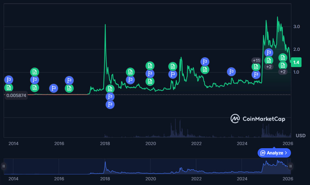 Der Kurs stieg stark an und erreichte im Juli 2025 einen Höchststand von 3,65 $ am 18. Juli, womit er sich dem bisherigen ATH von 3,84 $ aus Januar 2018 annäherte. Diese Entwicklung wurde durch mehrere Katalysatoren angetrieben: den erfolgreichen Abschluss des SEC-Rechtsstreits, das gestärkte Vertrauen der Investoren und die wachsende institutionelle Akzeptanz.
