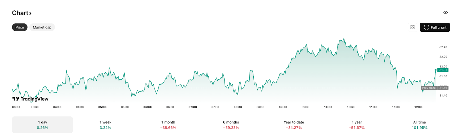 Die gleitenden Durchschnitte hingegen zeigen ein starkes Verkaufssignal (Strong Sell): Die 50-Tage-SMA und die 200-Tage-SMA liegen deutlich über dem aktuellen Preis (~82 $) und bestätigen einen dominanten mittelfristigen bis langfristigen Abwärtstrend.