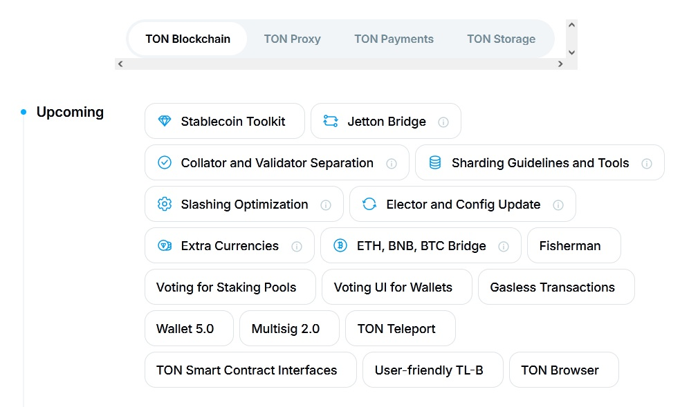 Auf der Website von TON finden Sie eine Roadmap für das Projekt. Sie enthält separate Abschnitte, die der Entwicklung der TON-Blockchain, des TON Proxy-Dienste, der TON Payments und der TON Storage gewidmet sind.