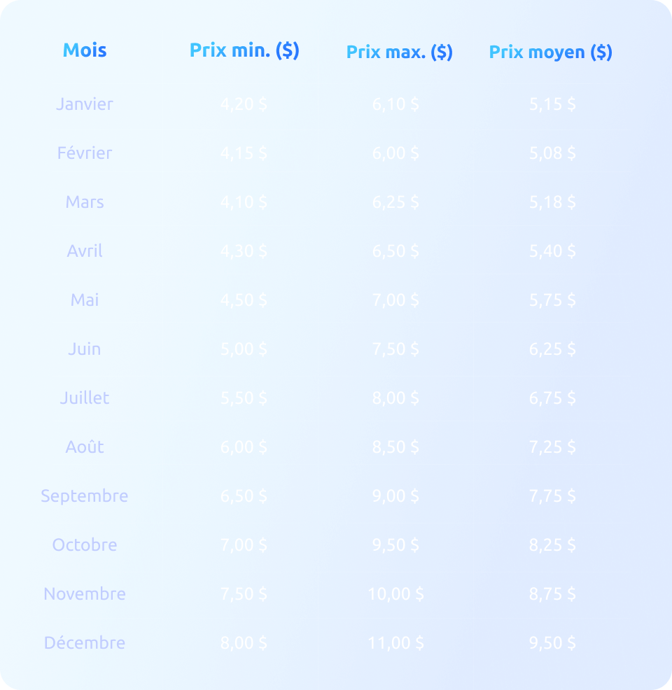 En 2024, après avoir atteint un sommet local de 11,24 $ en mai, le prix a commencé à baisser à nouveau. En novembre, une autre hausse de prix s'est produite, suivie d'une correction, qui est toujours en cours.