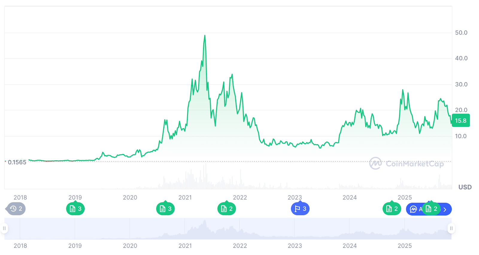 L'été 2025 a été marqué par une récupération spectaculaire. Dans la dernière semaine de juin et au-delà, le prix LINK a commencé à augmenter suite au rally Bitcoin. Entre juillet et août, Chainlink a connu une croissance impressionnante et significative, surgissant de 11 $ à 28 $. Le facteur qui a déclenché ce saut était le lancement réussi du Chainlink Reserve. Cela a permis au token de sortir de manière décisive du pattern de rounded bottom à long terme. Le 18 août, LINK a atteint 25,22 $, étant parmi les meilleures performances du mois.