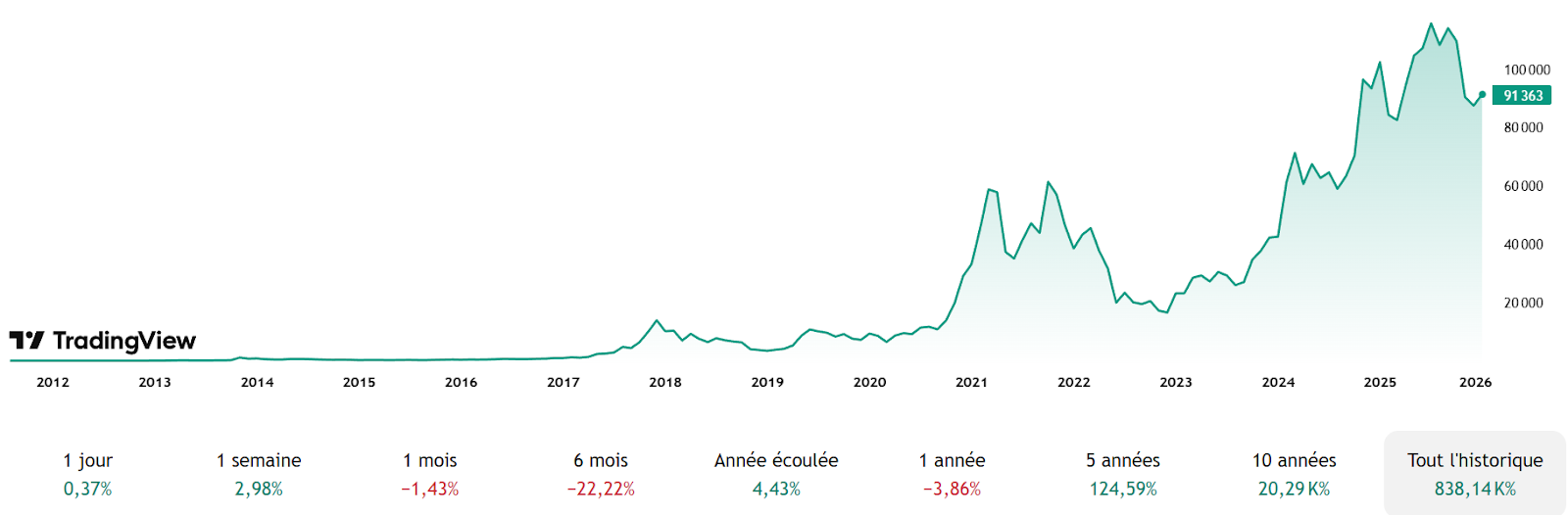 La question de savoir si Bitcoin va augmenter dépend de multiples facteurs interconnectés. Historiquement, Bitcoin a démontré une résilience remarquable. En janvier 2026, après avoir établi un nouveau record à 107 698 € en octobre 2025, le Bitcoin entame l'année dans une dynamique de recovery autour de 90 000-92 000 €, avec une correction limitée de -15-17% depuis le sommet.