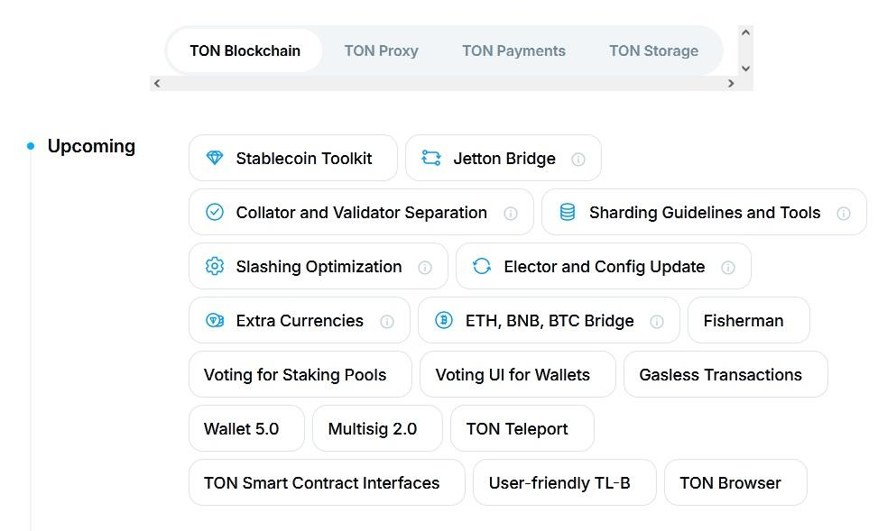 Le site web de TON fournit une feuille de route pour le projet. Cette feuille de route comprend des sections distinctes consacrées au développement de la blockchain TON, du service de procuration TON, des paiements TON et du stockage TON.