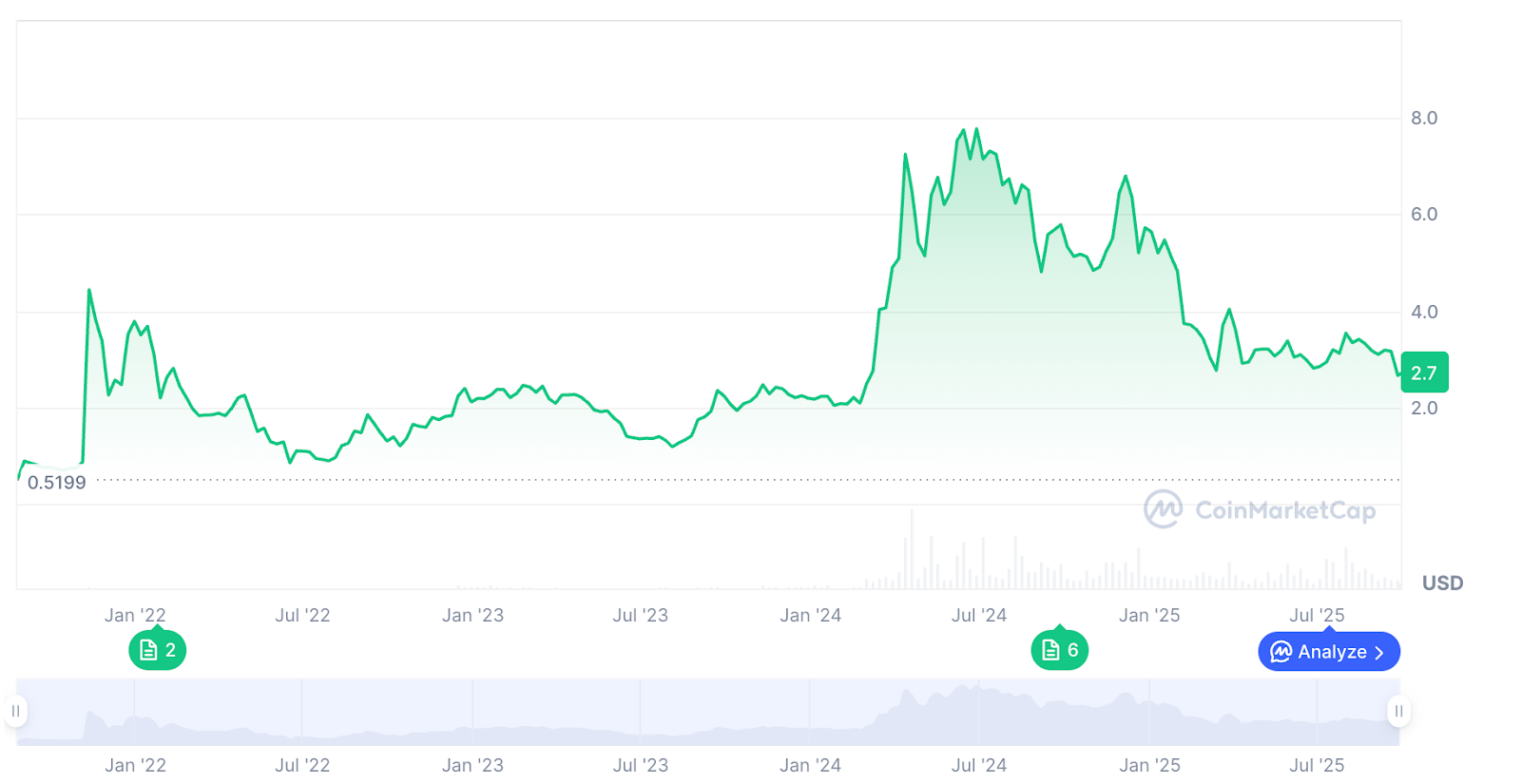 En septembre 2025, le Toncoin s'échange à 2,70 $. Malgré une correction significative depuis le début de l'année, il conserve sa position dans le top 20 des cryptomonnaies par capitalisation boursière avec environ 7,85 milliards de dollars.